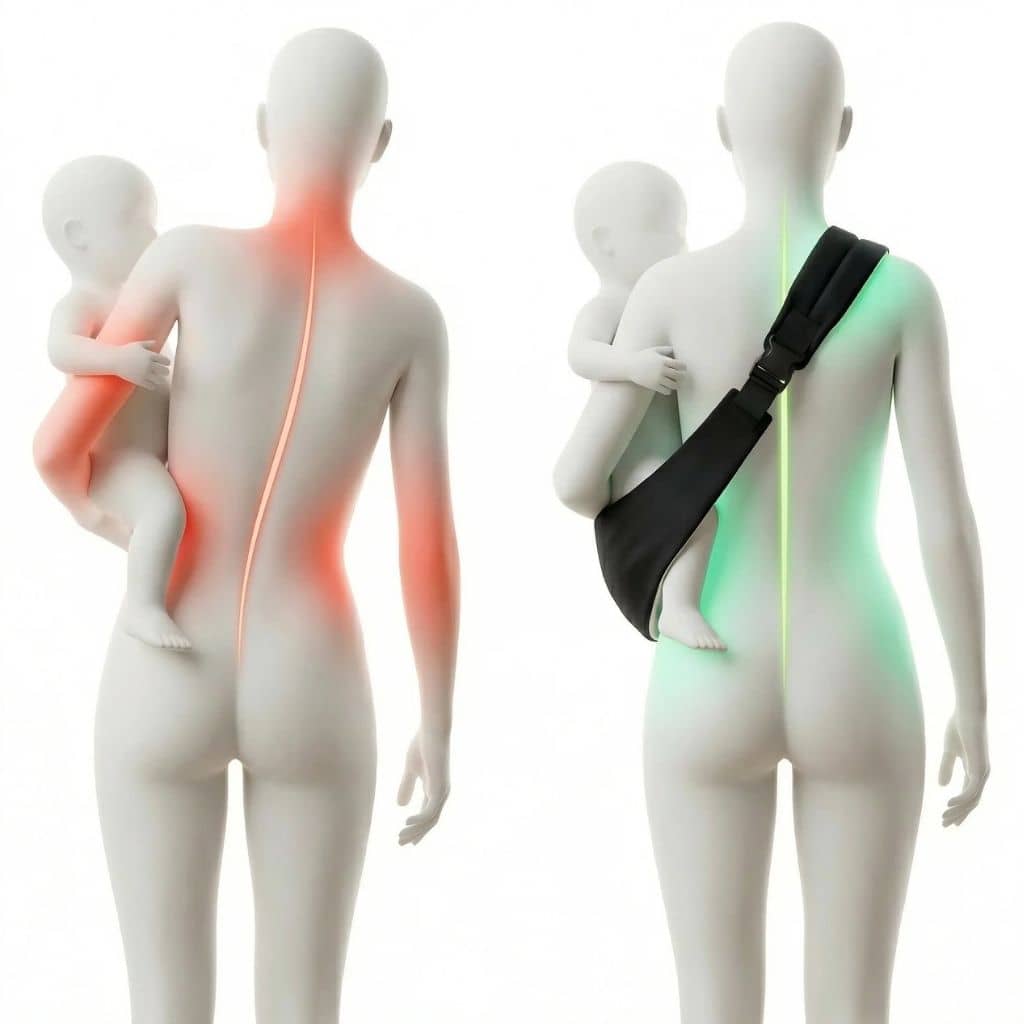 Porter dans les bras fatigue vite (épaule, dos, poignets). La sangle croisée rembourrée répartit la charge pour un portage confortable, même en fin de journée.